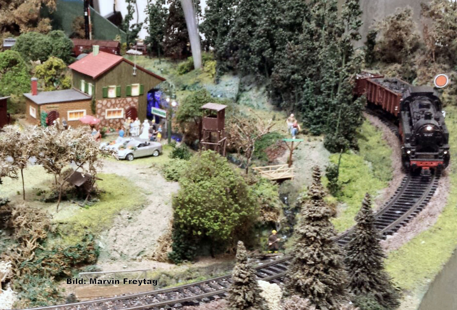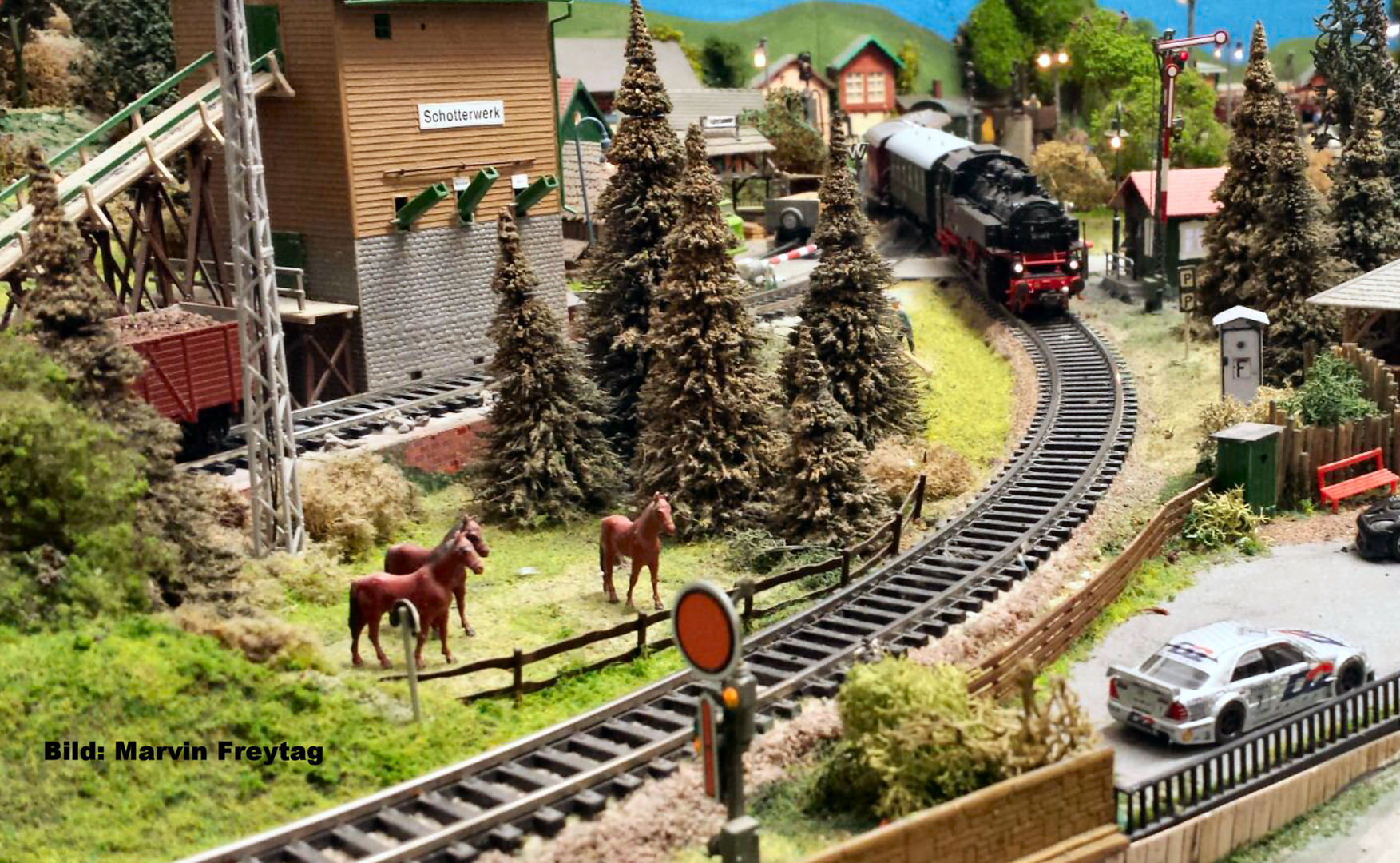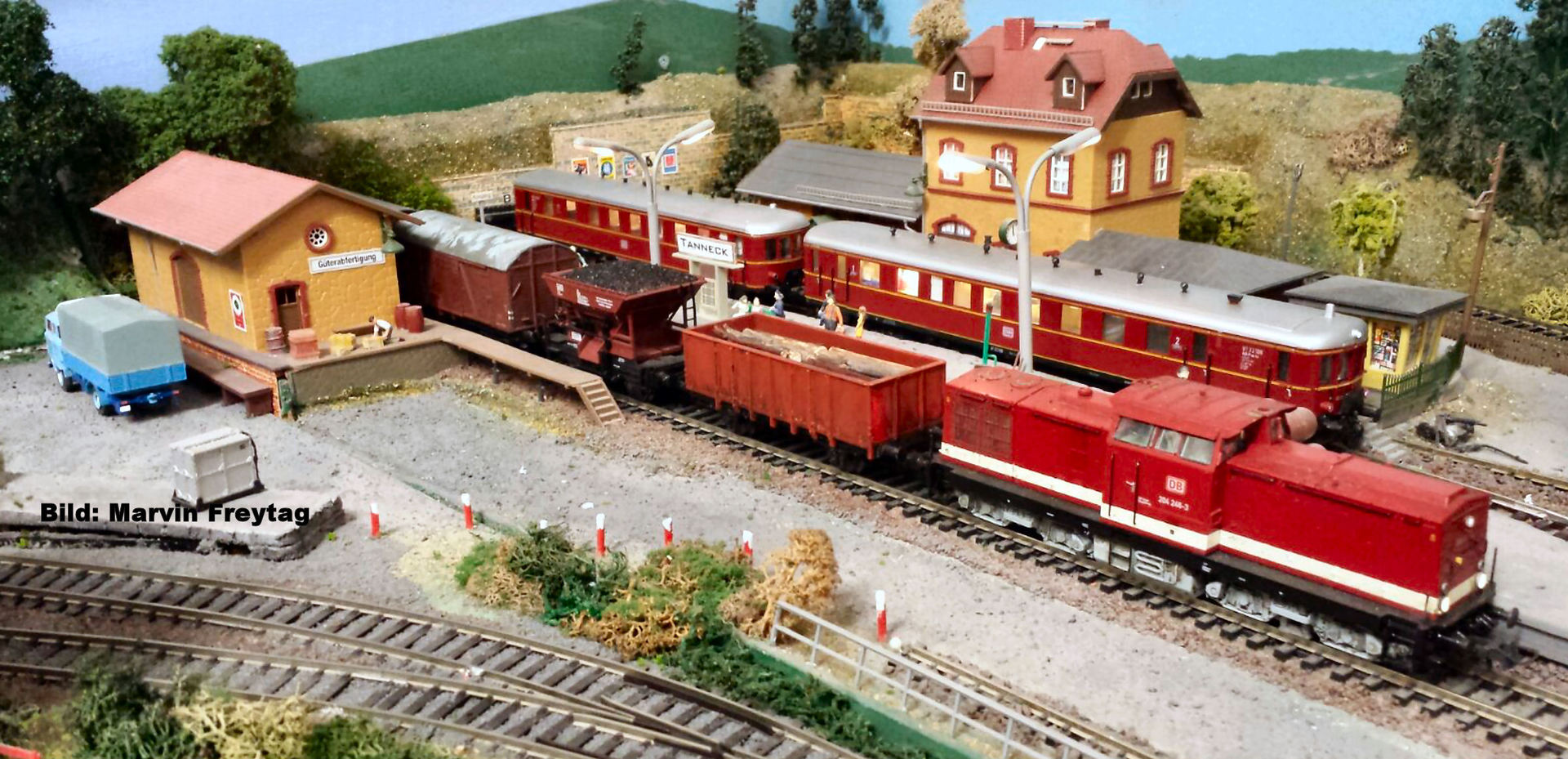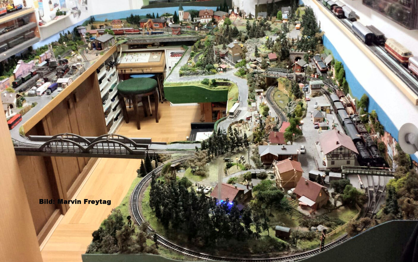 Nur wenige Modellbahner haben das Glück, einen ganzen Raum für das Hobby zu nutzen zu können. Unser Mitglied Gerhard Freytag hat dieses Glück und baut schon seit vielen Jahren zusammen mit seinen Enklen Marvin und Hendrik an seiner Heimanlage "Haseltal". Die Anlage umfasßt die beiden Bahnhöfe `Haselbach´ und `Tanneck´ sowie den Haltepunkt ´Moorgrund´. Neben vielen Rangiermöglichkeiten und langen Fahrstrecken gibt es auch Spielmöglichkeiten auf den Modellstraßen.