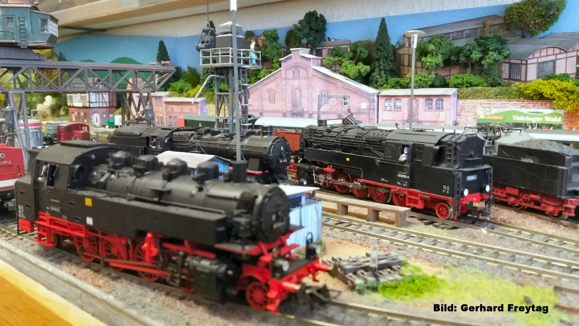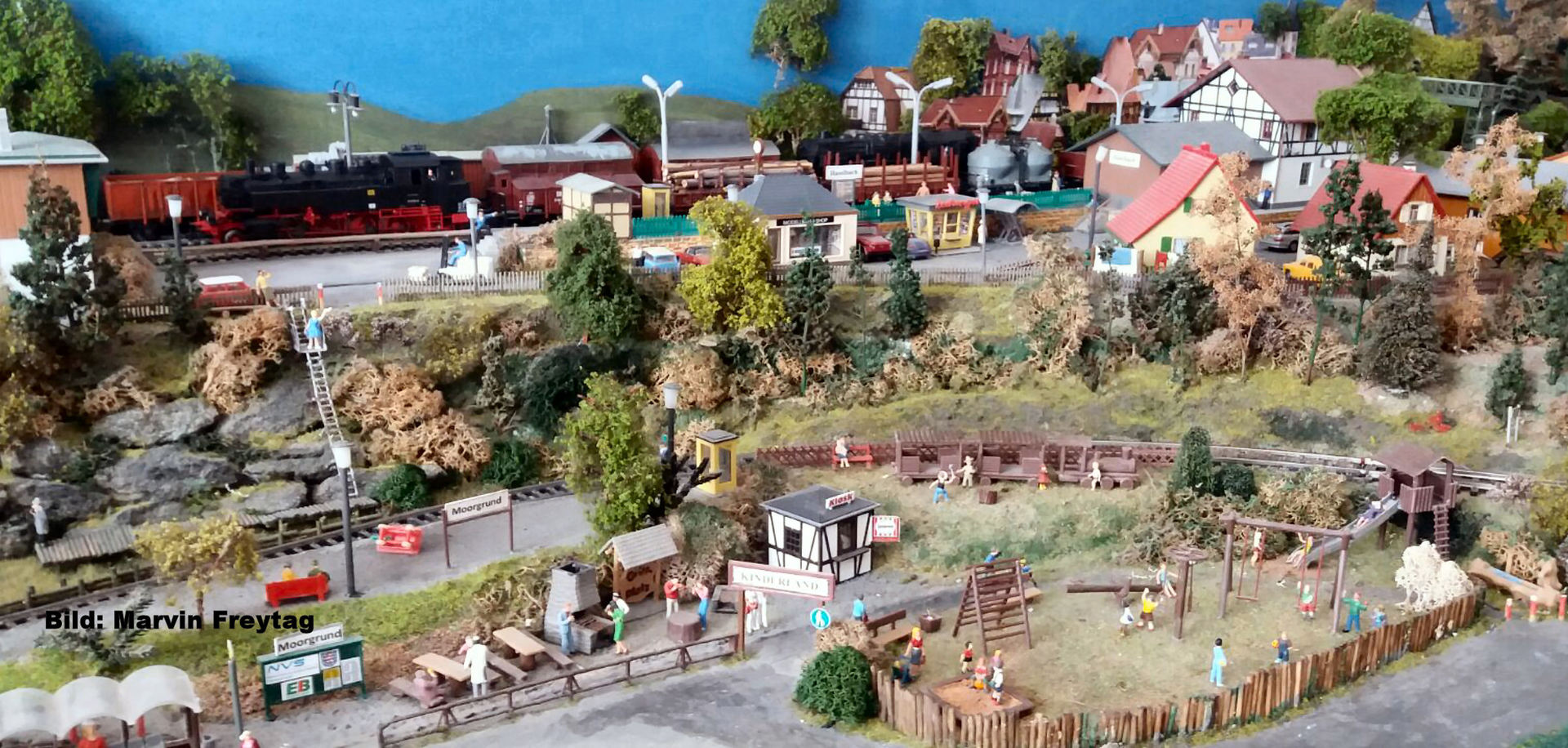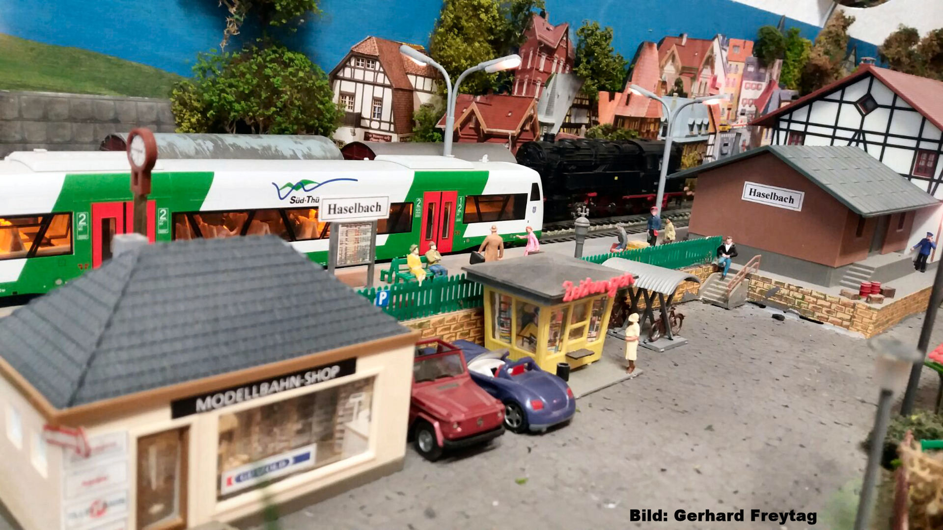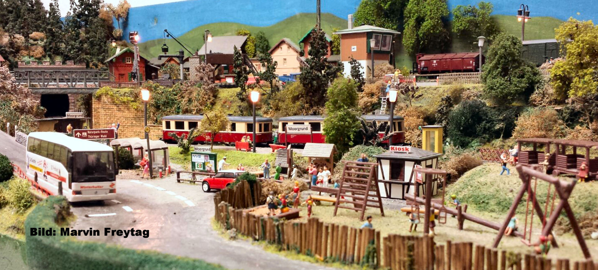 Nur wenige Modellbahner haben das Glück, einen ganzen Raum für das Hobby zu nutzen zu können. Unser Mitglied Gerhard Freytag hat dieses Glück und baut schon seit vielen Jahren zusammen mit seinen Enklen Marvin und Hendrik an seiner Heimanlage "Haseltal". Die Anlage umfasßt die beiden Bahnhöfe `Haselbach´ und `Tanneck´ sowie den Haltepunkt ´Moorgrund´. Neben vielen Rangiermöglichkeiten und langen Fahrstrecken gibt es auch Spielmöglichkeiten auf den Modellstraßen.