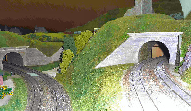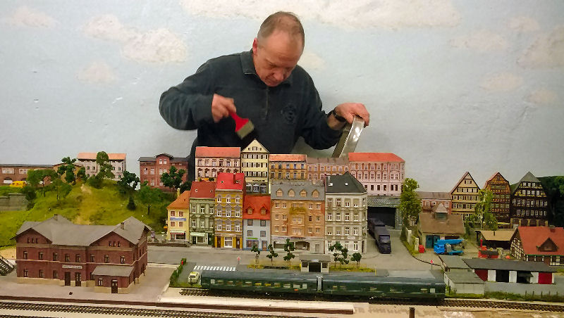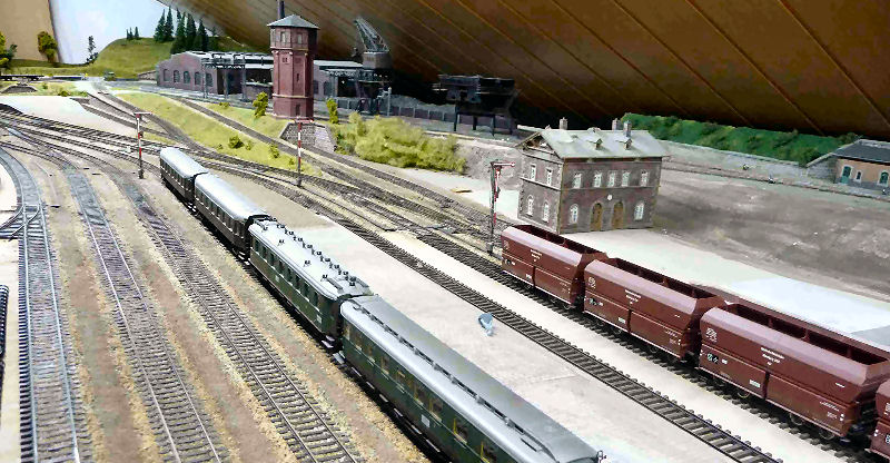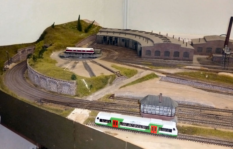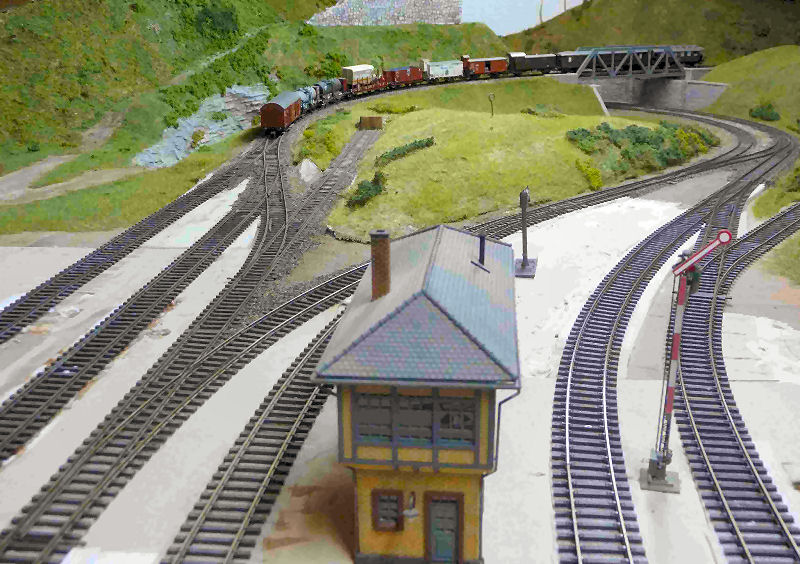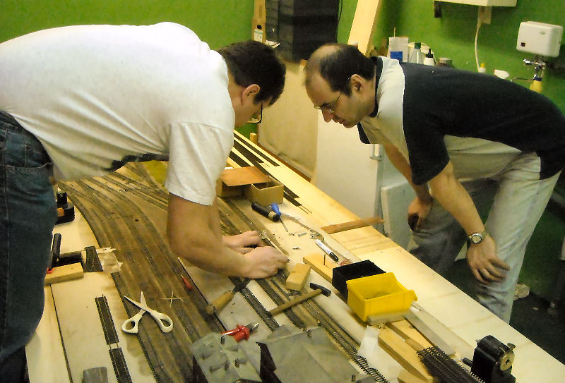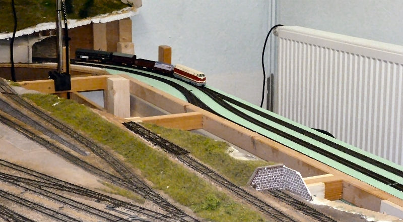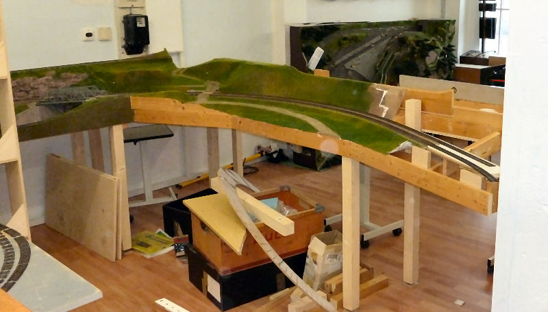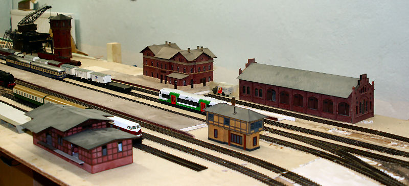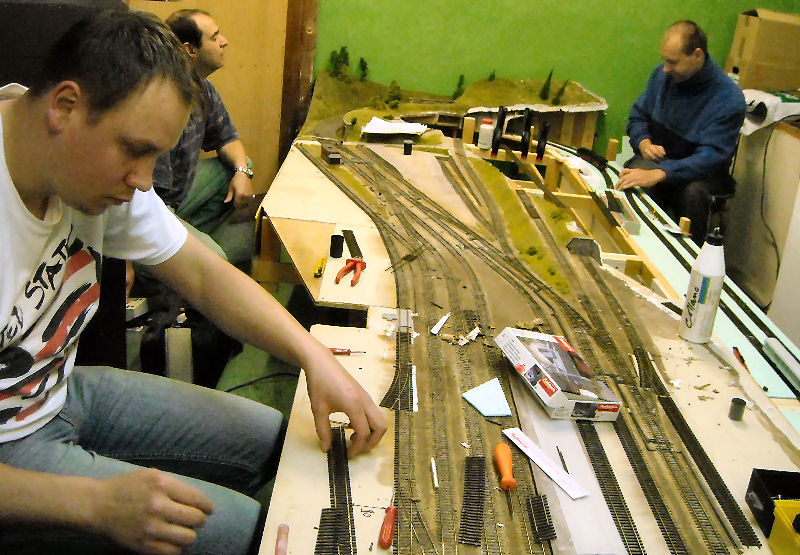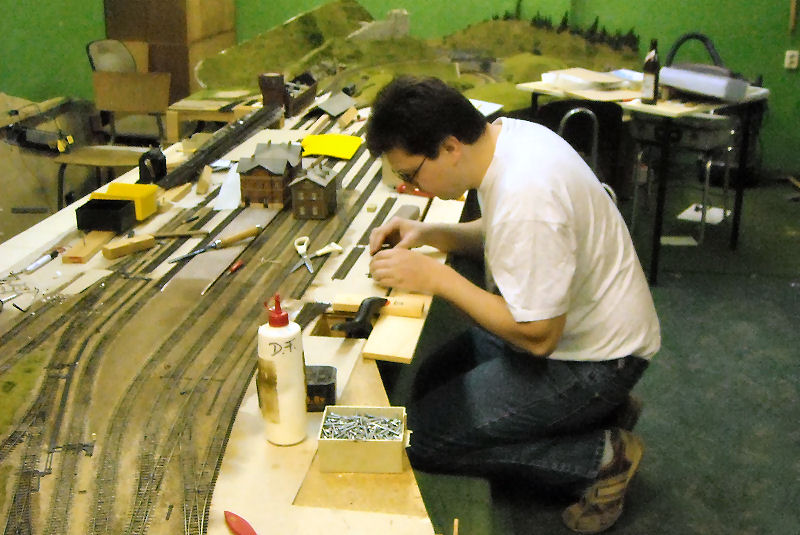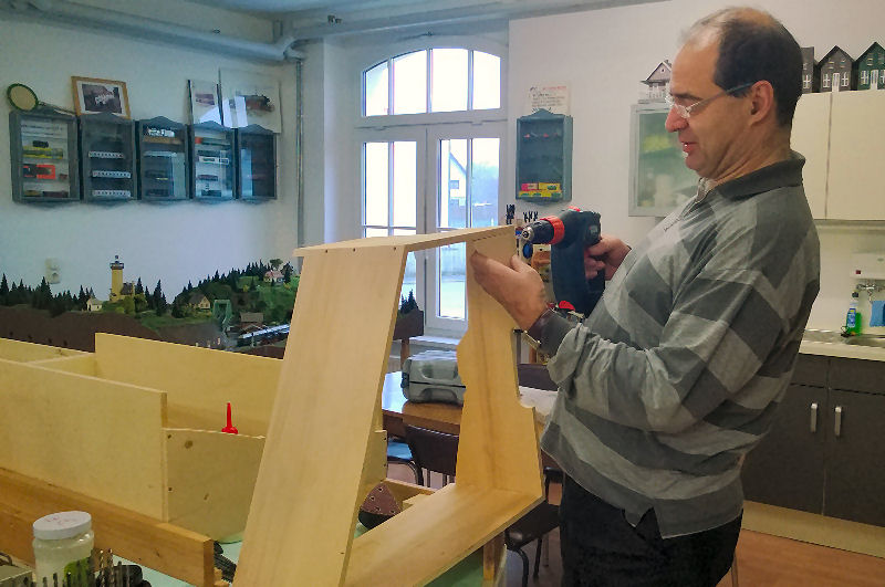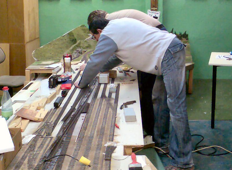 Anschließend konnten wir die Anlage endgültig aufbauen und noch fehlende Teile neu bauen. Es kam ein weiterer Schattenbahnhof dazu, der Endbahnhof der Nebenbahn und vieles weitere. Die Anlage wurde auch gleich auf neue, höhere Beine gestellt.